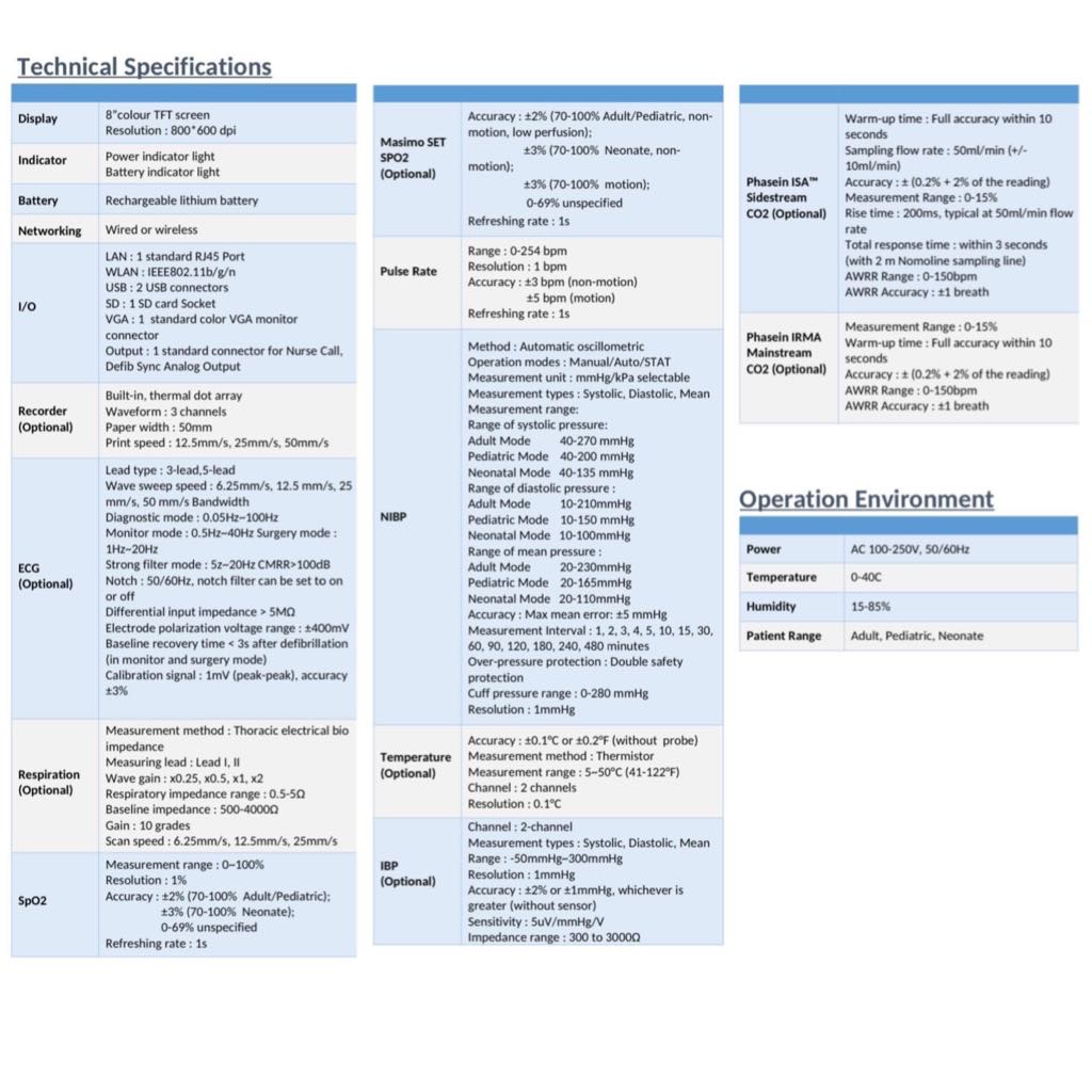 • Measured parameter – TEMP, ECG, heart rate, RESP, NIBP, etCO2, SpO2